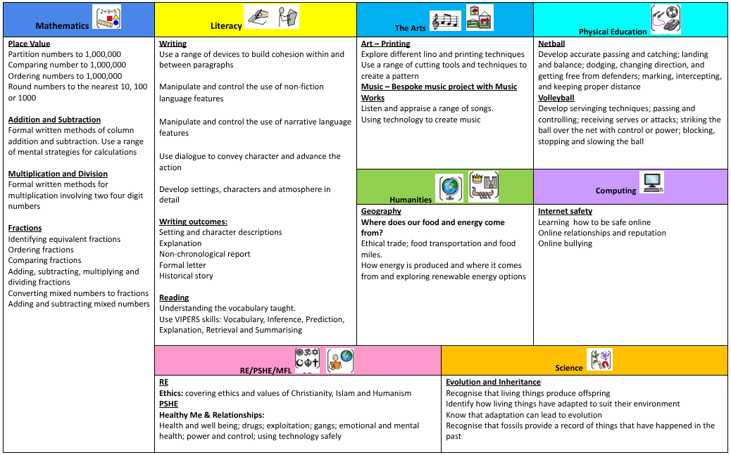 In Mathematics, we will revisit and strengthen our understanding of the four operations using formal written methods. They will also focus on fractions, percentages and decimals, ensuring they are secure in these areas ahead of their SATs assessments.